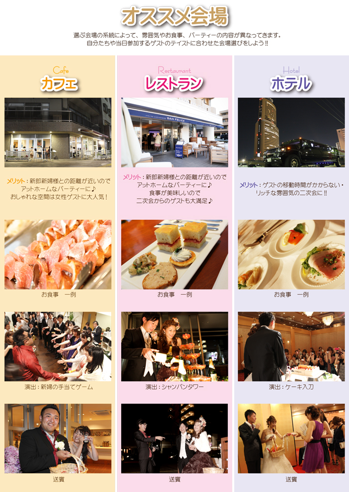 カフェ系・レストラン系・ホテル系など様々な会場で、お二人のイメージ通りの結婚式二次会を叶えます。